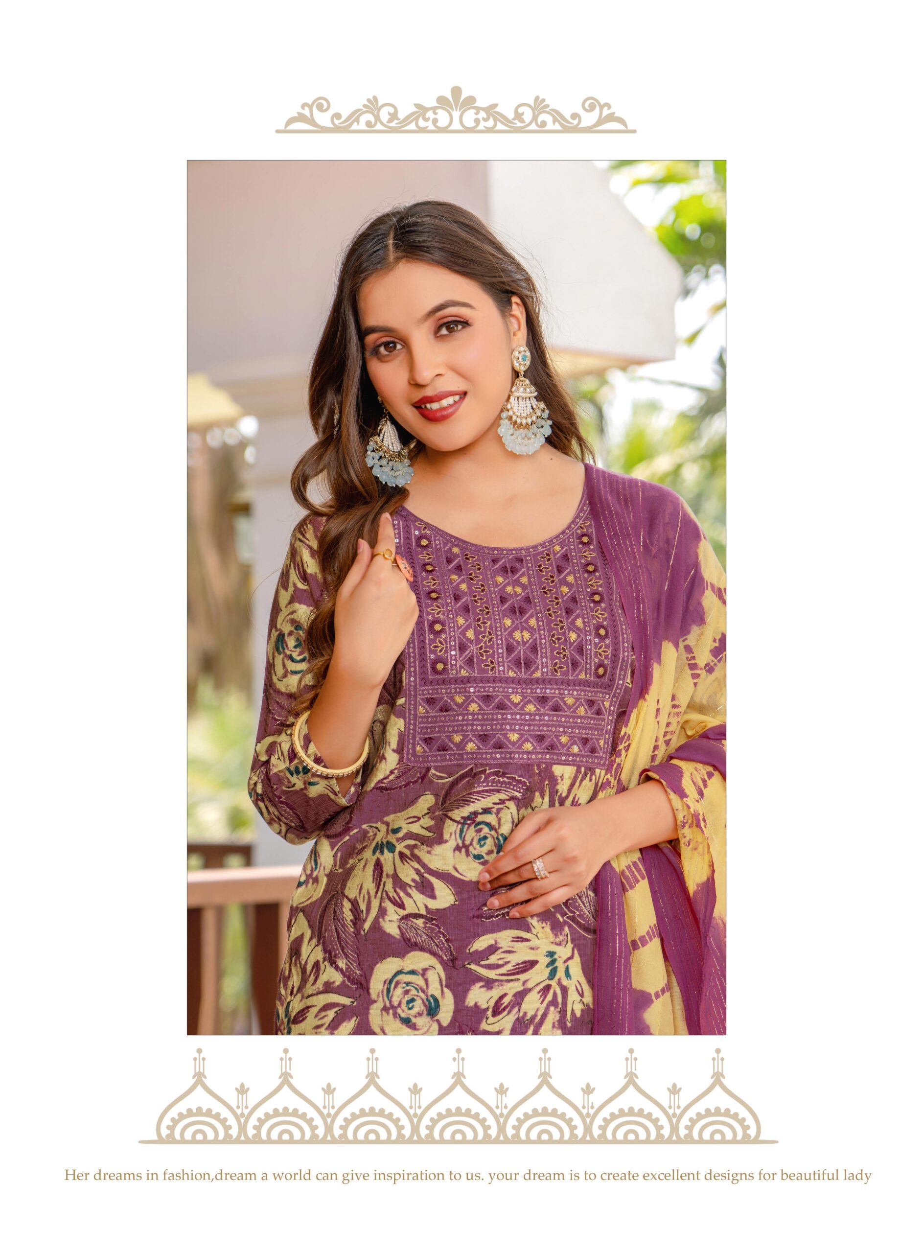 Fabric (likely):Roman Vertican (smooth, slightly stiff daily wear friendly)Intro: Elegant daily wear suit with traditional floral aesthetics—safe design, mass market ke liye perfect.